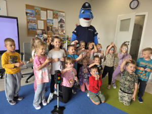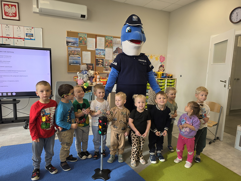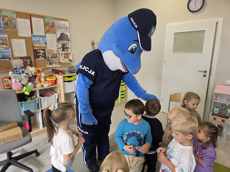 Największą atrakcją dla przedszkolaków była wizyta maskotki kujawsko-pomorskiej Policji – Polfina, który wprowadził wiele radości i uśmiechu. Dzieci chętnie witały się z sympatycznym delfinem, pozowały do wspólnych zdjęć i odpowiadały na pytania dotyczące bezpieczeństwa.