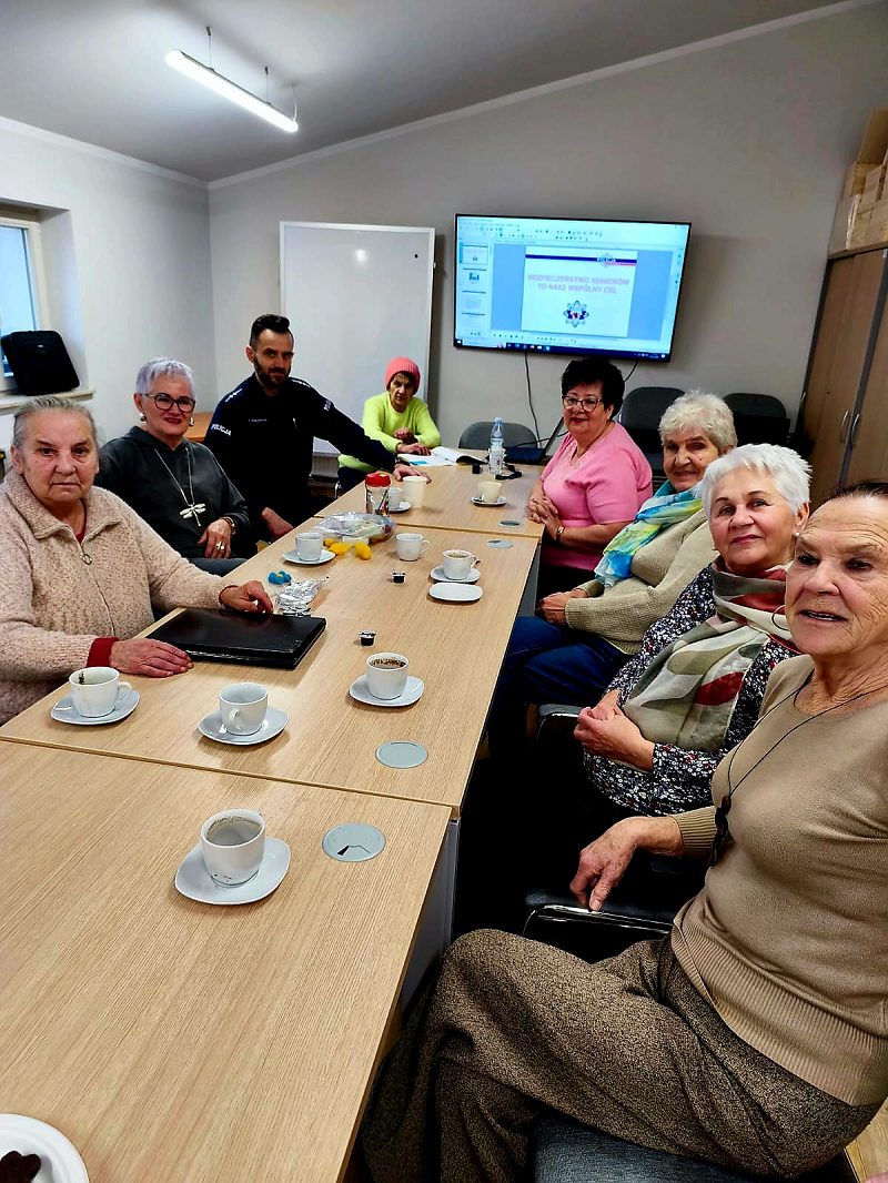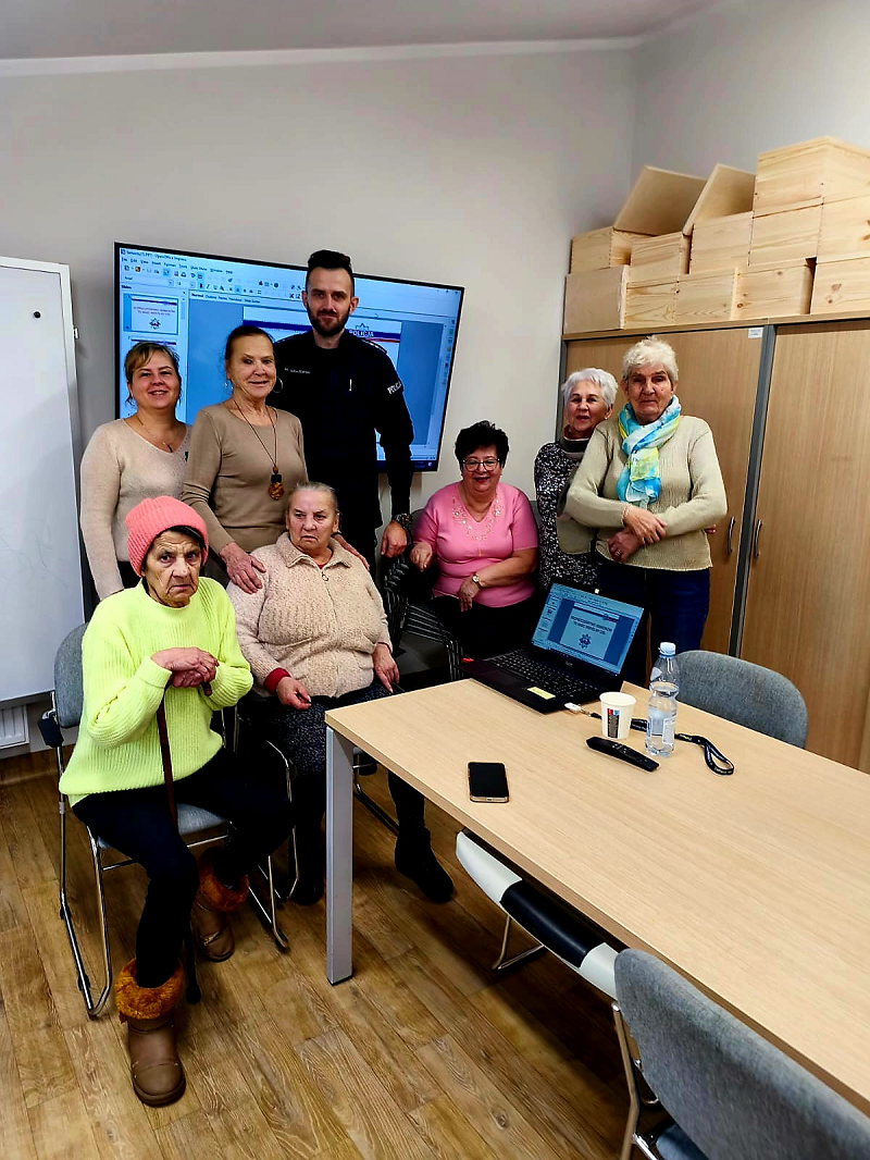 Ważnym elementem prelekcji były również bezpieczne zakupy świąteczne. Policjant przypomniał Seniorom, by w sklepach zwracali uwagę na swoje torby i portfele, nie przechowywali gotówki w jednym miejscu, a przy zakupach internetowych korzystali wyłącznie z pewnych, sprawdzonych stron. Uczestnicy spotkania dowiedzieli się także, jak rozpoznawać fałszywe SMS-y i linki prowadzące do stron podszywających się pod banki i firmy kurierskie.