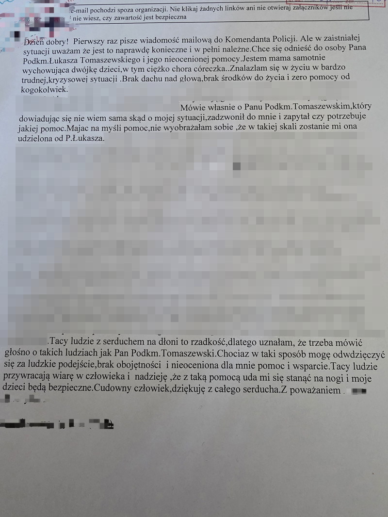 Czasami sytuacje, które wydają nam się zupełnie naturalne i zwykłe dla innych mogą być czymś wyjątkowym. Policjanci służą pomocą zawsze, gdy tylko mogą. Nie oczekują za to specjalnych podziękowań, bo wiedzą, że na tym polega ich służba. Nie znaczy to jednak, że słowa wdzięczności, jakie do nich trafiają, nie robią na nich wrażenia. Przekonał się o tym podkom. Łukasz Tomaszewski - Kierownik Posterunku Policji w Lisewie. Na skrzynkę Komendanta Powiatowego Policji w Chełmnie trafiły wyjątkowe podziękowania. Autorką listu jest kobieta, która znalazła się w ciężkiej sytuacji życiowej i otrzymała od policjanta realne wsparcie.